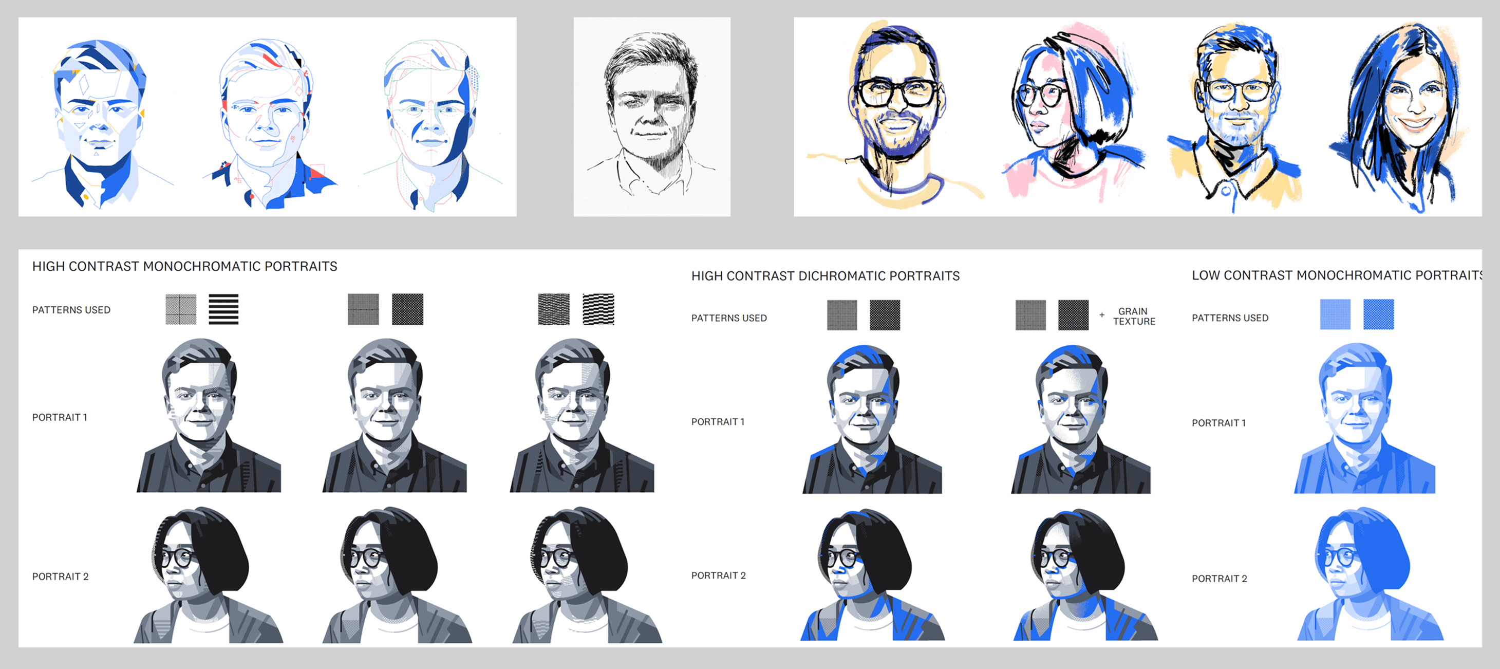 Jonny Ruzzo’s style fit immediately. Charcoal portraits with clean shapes and a strong line feel. We kept them monochrome, since the style already stood out on its own.